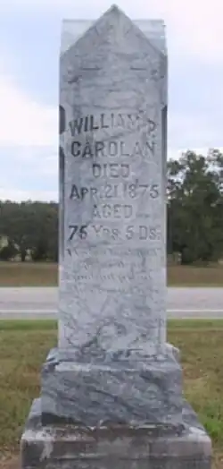Carolan is an unincorporated community in Logan County, Arkansas, United States. It lies five miles to the southwest of Booneville on State Highway 23. Carolan is named for William Philip Carolan, early farmer and merchant in the area. He was born on April 16, 1800, in South Carolina. He was married on September 12, 1822, in South Carolina to Hannah A. (nee Seeley), who was born on April 5, 1807, in South Carolina. Both died in the community of Carolan, on April 16, 1875, and April 9, 1877, respectively. They are buried in the Carolan Community cemetery. An amusing inscription on William Philip Carolan's tombstone describes him as "Baptist and Democrat".
