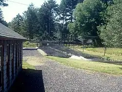 In 1802, the first wooden dam and a gristmill were built on the river at the site of the village, which was then known as Nichols Bridge.[2][3] A few years later, a cotton mill was established, with production buildings mostly located in Richmond and some employee housing located across the river in Charlestown. Rowland G. Hazard bought the mill in 1843 and renamed it the Carolina Mills Company in honor of his wife Caroline Newbold Hazard of South Kingstown. The village around the mill was also given the same name.[7] The Rhode Island Historic Preservation Commission described 19th-century Carolina as a "center for the surrounding area, including a school, a church, a post office, a bank, several stores, a blacksmith shop, and halls for meetings, lectures, and 'entertainments'."[3] The local post office was named "Carolina Mills" from 1850 until 1879, when it was renamed "Carolina."[8]
