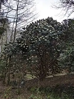 - Rhododendron falconeri - white flowering shrubs with large leaves characterised by rusty coloured woolly undersides, native to the mountains of North India. Emma Darwin mentioned the flowers of these specimen in her 1846 letter to Hooker: 'We have just received a blossom of Rhod Falconeri which has flowered in the open air at my brothers on Leith Hill Surrey'.[40][42]