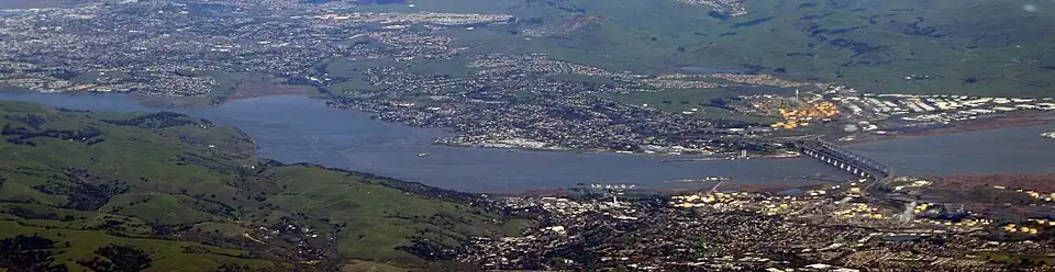 The Carquinez Strait (/kɑːrˈkiːnəs/; Spanish: Estrecho de Carquinez)[1][2] is a narrow tidal strait located in the Bay Area of Northern California, United States. It is part of the tidal estuary of the Sacramento and the San Joaquin rivers as they drain into the San Francisco Bay. The strait is eight miles (13 km) long and connects Suisun Bay, which receives the waters of the combined rivers, with San Pablo Bay, a northern extension of the San Francisco Bay.
