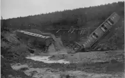 On the afternoon of 18 June 1914, a tremendous thunderstorm struck the mountains to the north of the Highland Main Line. The road bridge carrying the road from Carrbridge to Inverness across the Baddengorm Burn was swept away, while further down the valley the burn entered a narrow gorge, crossed by the railway by means of a narrow arch span of only 15 ft (4.6 m). The water was at rail level when the six-carriage 11:50 Perth to Inverness train, 9 minutes late leaving Carrbridge Station at 15:24, crossed the bridge. The first two carriages reached the other side but the bridge then gave way, its foundations having been undermined by a vortex of water. The third carriage was left on the north bank of the burn but the next was plunged into the torrent which soon demolished the carriage, drowning five passengers; remarkably four survived.[10]