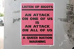 After graduating from Pratt in 1985, Moyer worked as a graphic designer for various advertising agencies, where she first developed skills with computer graphic software like Photoshop.[3] At the same time, she became more involved with lesbian and gay rights movements in New York after learning about ACT UP and Gran Fury through Avram Finkelstein, and began to apply her graphic design skills to her activism.[9][6][11] Moyer began creating agitprop in the early 1990s, studying historical movements like Constructivism and Situationism and artists like Ad Reinhardt.[7] Throughout the 1990s, she created posters, pamphlets, and graphics for various lesbian and gay activist groups in New York City, including Queer Nation, the Lesbian Avengers, the Irish Lesbian and Gay Organization, and the New York City Anti-Violence Project.[9] After discovering the Lesbian Avengers at the New York City Gay Pride March in 1992, Moyer designed the logo for the group.[12][11] The logo would be the subject of controversy almost 30 years later in 2021, when Gap used the logo on a t-shirt after purchasing the design from Moyer for $7,000, which she donated to the Lesbian Herstory Archives.[13] Some founding members of the Lesbian Avengers, such as Sarah Schulman, criticized the commodification of the movement, and the shirt was ultimately discontinued.[12]