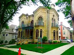 Some architectural historians have classified the house's style as Romanesque Revival. Others have placed it in the Rundbogenstil category, which means "round arch-style" and is an eclecticizing variation of Romanesque Revival originating in Germany.[4] It is characteristic of this style that many of the windows have round-arched frames within larger arches. At the top of the second story are ranks of fine dentils, also a hallmark of Rundbogenstil. The Italianate belvedere above the center flat bay reflects the style's indebtedness to Tuscan architecture.[5]