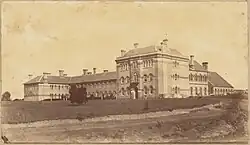 After the building was gutted by an 1877 fire, Philip Herapath supervised the reconstruction.[6] From 1869 to 1879, Thomas Aickin served as medical superintendent.[10] In 1879, a new wing to the asylum was under construction and stone for it was mined from nearby Oakley Creek. An estimated two-thousand tons of stone was made available in this exercise through detonation of 16 barrels of gunpowder under a 20-foot deep bed of lava, which created a miniature "earthquake" felt in the surrounding area.[11] The Crown purchased three allotments at a price of £4,200 to establish a farm for the asylum. It was to provide both food and work for the patients. A piggery was built in the 1880s and a milking shed, hay store, and farm manager's home were constructed c.1882.[8] In 1889 a news article reported the asylum had an orchard, dairy, and piggery with 50–60 Berkshire crosses.[12][8] The dairy shed had a Brutalist extension built on to it during Unitec ownership. This extension won an architectural award. It was later demolished in 2024 for the Carrington housing development.[8][13]