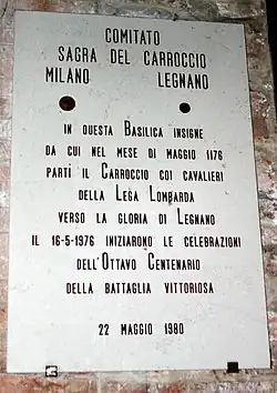 The carroccio was the protagonist in the battle of Legnano on 29 May 1176, during which it was defended, according to legend, by the Company of Death led by Alberto da Giussano, a fictional character who actually appeared only in literary works of the following century. According to the legend, during the fight, three doves, out of the burials of the saints Sisinnio, Martirio and Alessandro at the basilica of San Simpliciano in Milan,[14] rested on the carroccio causing the flight of Frederick Barbarossa.[15]