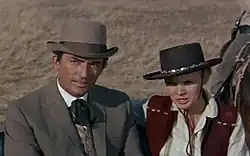 After her suspension with Warner Bros. was lifted, Baker appeared in William Wyler's Western epic The Big Country (1958).[43] The film was well received by critics, though the shoot was described as "problematic": Baker was four months pregnant at the time and had to wear restraining garments, and director Wyler reportedly had her on the verge of tears after forcing her to repeat the same take over 60 times, only to use the first one.[44] She followed The Big Country with lead roles in two romances, portraying a nun in The Miracle (1959), co-starring Roger Moore, and in But Not for Me (1959), a comedy with Clark Gable. The New York Times praised Baker's performance in But Not for Me, saying: "Miss Baker, being a young lady who not only has looks, but also can act, makes you understand why Mr. Gable would like to cheat a little bit on Father Time."[45] She disliked The Miracle so much that she bought out her contract with Warner Bros., putting her in considerable debt. But Not for Me was made at Paramount.[46]