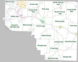 Townships in Arkansas are the divisions of a county. Each township includes unincorporated areas; some may have incorporated cities or towns within part of their boundaries. Arkansas townships have limited purposes in modern times. However, the United States census does list Arkansas population based on townships (sometimes referred to as "county subdivisions" or "minor civil divisions"). Townships are also of value for historical purposes in terms of genealogical research. Each town or city is within one or more townships in an Arkansas county based on census maps and publications. The townships of Carroll County are listed below; listed in parentheses are the cities, towns, and/or census-designated places that are fully or partially inside the township. [23][24]