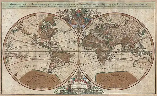 The first map of France was drawn by Oronce Finé and printed in woodcuts in 1525.[2] It testifies to the will of the political power to mark its presence on the territory; to affirm, to build limits, borders, to arrange its territory, and to consolidate the internal economic markets. In the 16th century, Dieppe appeared as an important school of cartography. Pierre Desceliers allowed the realization of many maps. At the same time, the Portolan maps of the Portuguese sailors had the most recent knowledge obtained by the Dieppois sailors in their exploration of Canada.
