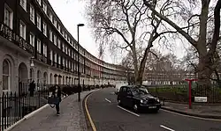 The crescent is composed of several hotels set in their original Georgian buildings. The east side of the gardens was gradually demolished during the first half of the 20th century. Canterbury Hall, a block of flats built in an Art Deco style, was built here in the 1930s. It later became an intercollegiate halls of residence for the University of London. It was joined by two further halls of residence for the University of London: Commonwealth Hall in the 1950s and Hughes Parry Hall in 1969.[4] These buildings were replaced by the Garden Halls in 2014–2016, although the tower block section of Hughes Parry Hall still stands.[5]