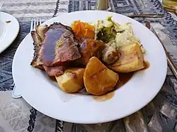 Carveries are often found in pubs and hotels,[3] particularly on weekends, when they offer Sunday roasts to a large number of people. The meat is usually accompanied by potatoes, vegetables, stuffing, gravy and sauces.