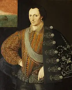 William Cary (1576–1652), son and heir of George Cary (1543-1601), was Justice of the Peace for Devon, MP for Mitchell, Cornwall, in 1604,[31] eldest son and heir by his father's first wife. He is sometimes said to be the model for Will Cary featured in Westward Ho!,[32] the 1855 novel by Charles Kingsley (1819–1875), who appears in the narrative concerning the Spanish Armada in 1588, although he would have been a boy aged just 12 at the time. However the "daring foreign exploits attributed to him are entirely fictional".[31] Kingsley spent much of his childhood at Clovelly as his father was Rev. Charles Kingsley, Curate of Clovelly 1826-1832 and Rector 1832-1836. Indeed the author's small brass monumental tablet is affixed to the wall of the church under the mural monument of Sir Robert Cary (1610–1675), eldest son of William Cary (1576–1652).[32]
