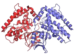CRISPR-associated protein 1 (cas1) is one of the two universally conserved proteins found in the CRISPR prokaryotic immune defense system. Cas1 is a metal-dependent DNA-specific endonuclease that produces double-stranded DNA fragments.[1] Cas1 forms a stable complex with the other universally conserved CRISPR-associated protein, cas2, which is essential to spacer acquisition for CRISPR systems.[2]