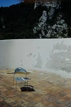 Casa Malaparte is a red masonry box with reverse pyramidal stairs leading to the roof patio. On the roof is a freestanding curving white wall of increasing height. It sits on a dangerous cliff 32 metres above the sea overlooking the Gulf of Salerno. Access to this private property is either by foot from the town of Capri or by boat and a staircase cut into the cliff. Casa Malaparte's interior and exterior (particularly the rooftop patio) are prominently featured in Jean-Luc Godard's 1963 film, Contempt (Le Mépris).[3]
