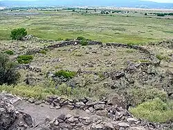 Unique and unusual features characterize the site. The Great Kiva, painstakingly constructed of volcanic rock, is the centerpiece. A steep basalt staircase set into a crevice of the high basalt cliff wall leads to the top of the mesa.