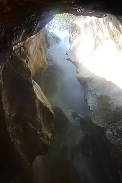 Over the thousands of years, large, unstable slabs of rock, stones and piles of detritus were sometimes detached and washed forward, causing and still causing the current design of the channel. Today the river penetrates into the cave in the mountain and the waterfall drops a total of 98 meters down the channel.[4]