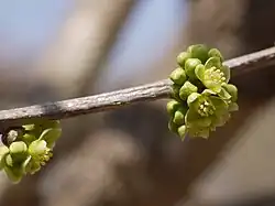 The inflorescence of chilla are arranged in a axillary glomerulus.[6] They are bisexual flowers, with both male and female reproductive parts. The flowers are a white with a slight green tint. There are no petals present, however there are 5 sepals that are approximately 3 mm long. There are 8 stamen in a row which are about 2 mm long. The flower has a superior ovary that has 3 carpals present, and a short style.[6] The plant most commonly flowers between February and August.[7] Pollination can occur via insects, self, or cross pollination.[6]