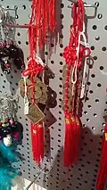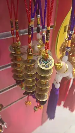 In feng shui, coin-swords are often hung to frighten away demons and evil spirits.[26][27][28] Coin-swords are a type of Chinese numismatic charm that are primarily used in southern China.[29] The supposed powers of coin-swords do not come from the associated wealth symbolism that usually comes with cash coins.[26] But with the design form of the cash coins used to make the sword, as well as the dynastic origins of the cash coins that carry the Emperor's reign era title.[26] As such, in feng shui the supposed power of the coin-swords will depend heavily on which Chinese emperor's inscription is written down on the cash coins.[26]