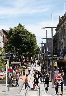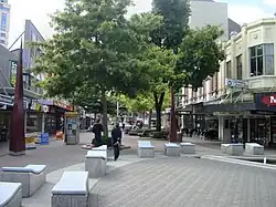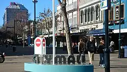 City Mall is the main pedestrian mall in the central city of Christchurch, New Zealand, comprising two sections of Cashel Street plus the Bridge of Remembrance and one section of High Street. It is also known colloquially as Cashel Mall.[1][2][3][4] The Bridge of Remembrance was pedestrianised in 1976. The main mall was closed to traffic on 11 January 1982 and formally reopened as a pedestrian mall on 7 August, but it was not until 1992 that the entire mall was paved. The mall was redeveloped between 2006 and 2009, and track was installed for an expansion of the heritage tram network.