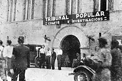 Sangenis spoke violently against the parliamentary democracy,[93] yet it is not known whether and if yes to what extent he was involved in Carlist conspiracy against the Republic, initially designed as an exclusive Carlist project and then amalgamated into an alliance with the military.[94] None of the sources consulted mentions him as taking part,[95] though later the revolutionary tribunal claimed that he "ajudà amb diners al cop feixista", supported the Fascist coup with money.[96] During the July rebellion he was in Lérida, where the rising failed. At unspecified time in late July or early August he was detained. On August 22 he was delivered for a trial by a newly established Tribunal Popular, which has just commenced its sittings. The tribunal was dominated by the radical left-wing militants; its president Francesc Pelegrí Garriga[97] from POUM and the prosecutor José Larroca Vendrell[98] from CNT were railway workers.[99] Sangenis was charged not only with financing the coup, but also with pressing repressive legislation in the aftermath of the 1934 revolution.[100] Following a very brief session, described by one historian as a "kangaroo trial",[101] Sangenis was sentenced to death; reportedly this was the first death sentence passed by this tribunal.[102] Half an hour later he was shot at the local cemetery.[103] His property was immediately expropriated.[104] Pelegrí and Larroca died on exile in France; one unnamed individual complicit in the killing of Sangenís, a FAI member, was later apprehended and executed by Francoist authorities.[105]