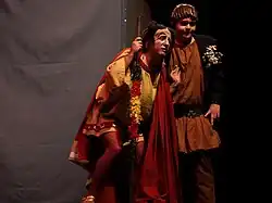 Cleostrata's maid Pardalisca comes rushing out, apparently in great distress, lamenting in cretic metre in an entertaining parody of tragic style.[10] She falls into Lysidamus's arms, and tells him that Casina has got hold of a sword and is threatening to kill whoever tries to go to bed with her that day. Lysidamus makes a slip and asks "She's going to kill me?" Meanwhile Pardalisca, speaking aside to the audience, tells them that her play-acting is all a trick thought up by Cleostrata. She goes on to tell Lysidamus that Casina in fact has two swords, one to kill him and the other to kill Olympio. Lysidamus in alarm offers her a reward of slippers and a gold ring if she can persuade Casina to put down her sword.