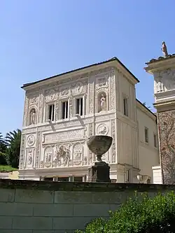 Upon Paul IV's death on 18 August 1559, Pope Pius IV took on the project, which had not yet been completed, and, turning to Pirro Ligorio, improved it. The complex, as it was completed in 1562, comprised an elliptical cortile, two free-standing portals, and the loggia with its fountain. Rich sculptural stuccos, once supplemented by some fifty ancient Roman sculptures, enliven the exterior (illustration).[1] A team of at least six major painters, including Federico Barocci, Federico Zuccari, and Santi di Tito and their assistants, frescoed the interiors.[2]