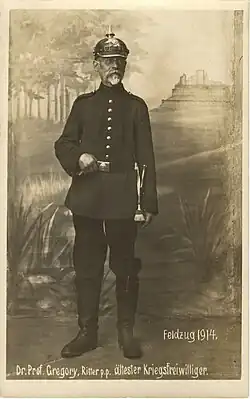 On August 11, 1914, Gregory, who had been a citizen of Saxony since 1881, enlisted in the German Army as its oldest wartime volunteer.[7] He became a second lieutenant in November 1916 and died on April 9, 1917, in a field hospital in Neufchâtel-sur-Aisne, France.[8]on the western front.