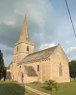 Geoffrey de Clinton built the Church of England parish church of Saint Peter in the Norman style before 1123. In 1318 Lady Montacute, who was a major benefactor of the Priory of St Frideswide, Oxford, made Decorated Gothic additions to St Peter's: the west window of the nave, east window of the chancel, the broach spire and the upper part of the tower on which it rests.[7] Fragments of Medieval wall painting from this period survive in the church, including a Doom over the Norman chancel arch.[8]