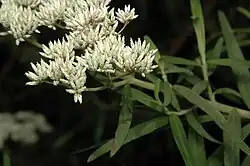 Cassinia trinerva is an erect shrub or tree that typically grows to a height of up to about 8 m (26 ft), its branchlets sticky and covered with glandular and cottony hairs. The leaves are narrow lance-shaped, 30–120 mm (1.2–4.7 in) long and 3.5–6 mm (0.14–0.24 in) wide on a petiole 1–4 mm (0.039–0.157 in) long with three longitudinal veins. The upper surface of the leaves is slightly sticky and the lower surface is cottony-hairy. The flower heads are 2.5–3.5 mm (0.098–0.138 in) long and 1–1.5 mm (0.039–0.059 in) wide with three or four white florets surrounded by fourteen to eighteen involucral bracts in three to five whorls. The heads are crowded in dense corymbs 60–120 mm (2.4–4.7 in) in diameter. Flowering occurs from December to March and the achenes are 0.5–1.0 mm (0.020–0.039 in) long with a pappus 2.0–2.5 mm (0.079–0.098 in) long.[2][3][4]