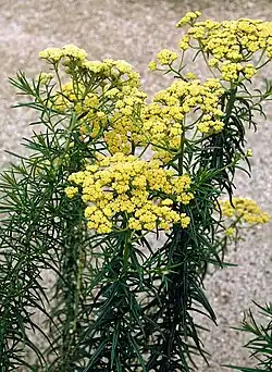 Cassinia venusta is an erect shrub that typically grows to a height of 1–2 m (3 ft 3 in – 6 ft 7 in) with its branchlets densely covered with glandular hairs. The leaves are needle-shaped, 50–70 mm (2.0–2.8 in) long and 1–3 mm (0.039–0.118 in) wide. The upper surface of the leaves is glossy green and slightly sticky, the edges are rolled under and the lower surface is covered with woolly hairs. The flower heads are pale yellowish to green, 4–4.5 mm (0.16–0.18 in) long, 1–2 mm (0.039–0.079 in) wide, each head with four to seven dark yellow florets surrounded by ten to fourteen papery involucral bracts 2–3 mm (0.079–0.118 in) long. Between hundreds and thousands of heads are arranged in corymbs 65–85 mm (2.6–3.3 in) in diameter. Flowering occurs from November to February and the achenes are about 1 mm (0.039 in) long and lack a pappus.[2][3]