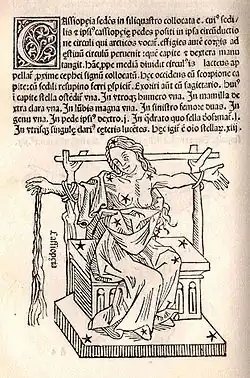- ^ Tripp, s.v. Cassiopeia. According to Apollodorus, 2.4.3, and Hyginus, De astronomia 2.10, Cassiopeia boasted that she was more beautiful, while according to Hyginus, Fabulae 64, it was that her daughter Andromeda was more beautiful.
