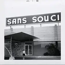 A grand opening for the renamed Sans Souci Hotel took place on August 21, 1955, following renovations which included a two-story, 82-room hotel[6] and an Olympic-size swimming pool. Future additions were planned for the 12-acre property, including a casino, nightclub, and restaurant.[7][8][9] The casino portion opened on October 23, 1957.[10][11] It was operated by George E. Mitzell and Harold V. Hinds.[12] The property also featured live entertainment in the new 400-seat Jamaica Room.[13] At the end of 1957, Mitzell announced plans to add 100 additional rooms,[14] although these did not materialize.[6] In 1958, a meat company filed a $21,500 lawsuit against the Sans Souci for lack of payment.[15] Saxophonist Charlie Ventura also filed a lawsuit, after suffering a fall on the casino's stage during a performance.[16]