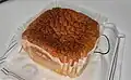 To suit the tastes of Japanese people, mizuame syrup was added to the sponge cake to make it more moist, and zarame (coarse sugar) was added to the bottom to give it a coarser texture.[5] Castella is usually baked in square or rectangular molds, then cut and sold in long boxes, with the cake inside being approximately 27 cm (11 in) long.