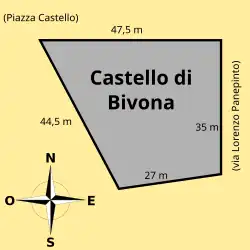 The layout of the castle has been determined from old maps of Bivona. Its dimensions were as follows, giving it an area of around 1,700 m2 (18,000 sq ft):[3]