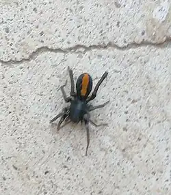 Castianeira crocata is a species of true spider in the family Corinnidae, sometimes called by the common name red stripe spider.[1] The species was first described by Nicholas Marcellus Hentz in 1847. It is found in the United States.[2][3][4][5] Though its body shape is quite different, its characteristic black body and red-marked back puts it at risk of being mistaken for a black widow spider.[1]