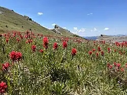 The species name, "rhexiifolia", means with leaves like Rhexia, the flowers commonly called "deer grass". When combining Rhexia with "folia" Rydberg just dropped the "a", but this is no longer considered proper usage. Since about 2005 Castilleja rhexiifolia with a second "i" replacing the "a" is the preferred spelling in used in most botanical sources.[14] Like Rhexia the paintbrush has three prominent veins in its leaves.[15] Common names for Castilleja rhexiifolia include "rosy paintbrush",[3] "alpine paintbrush",[16] "alpine red paintbrush",[17] "subalpine paintbrush",[4] "splitleaf paintbrush",[9] "splitleaf painted-cup",[18] or "rhexia-leaved paintbrush".[3] However, the name "alpine paintbrush" is also applied to Castilleja puberula.[9]