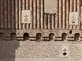 The towers on the corners of the walls are rectangular. The surviving wall is machicolated. This coupled with the talus served as a formidable defence. The battlements on the walls have been constructed as both ornament and as defensive fortifications, so they have been built with crests that jut out from the walls. Brickwork in Mudejar has been used here as well.[5]