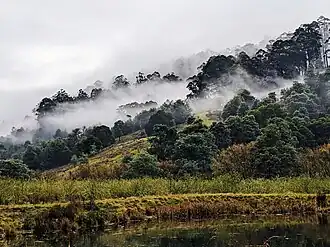 ![]() Fog-bound mountains at Castle Forbes Bay | |