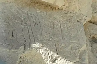 The Castle Gardens Petroglyph Site is a 6-mile (9.7 km) by 1-mile (1.6 km) region of vertical cliff faces in Fremont County, Wyoming, United States, with extensive petroglyph images incised in the rock faces. The glyphs include images of water turtles and circular shields, as well as human and animal figures.[2] The figures with circular shields are particular to the area, and are known as Castle Gardens Shield style images. A consensus of researchers is that the figures were carved by Athabaskans related to the Navajo and Apache, some time between 1000 AD and 1250 AD.[3] The site is being developed by the Bureau of Land Management, and may be visited.[4]