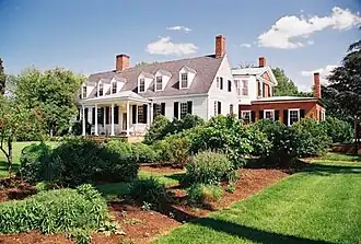 The original clapboard, colonial residence was built by Walker in 1764, with a front porch facing west and six dormer windows. William and Judith Rives added the brick, federal style addition to the home in 1824, which was built by Captain John Perry, one of Thomas Jefferson's master brickmasons. In 1844 the home's columned conservatories were added to each end of Perry's addition by another Jefferson brickmason, William B. Phillips.