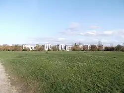 The development has been controversial, since the four to five storey blocks overlook Port Meadow, an historic open area to the north with views of some of Oxford's skyline.[12] Campaigners warned of damage to views of Oxford.[13][14] There was an online petition[15] and a "Save Port Meadow" campaign was established in December 2012.[16] Concern was raised by the Oxford Preservation Trust,[17] Layla Moran MP, the Liberal Democrats,[18] and Green Party.[19] Some members of Oxford University expressed anger.[20] The development has been likened by a critic to building a "skyscraper beside Stonehenge".[21]