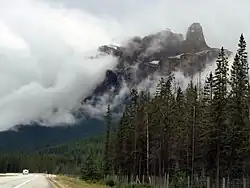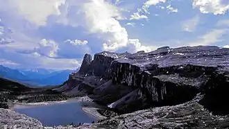 Castle Mountain is the easternmost member of the Main Ranges in the Bow Valley.[3] Passing through the mountain is the Castle Mountain Fault, a thrust fault which separates it and the other nearby peaks of the Main Ranges from the Sawback Range to the northeast, the westernmost of the Front Ranges in the region.[4][5] Castle Mountain's upper sections, including its cliff faces, consist of late Pre-Cambrian and Cambrian age sedimentary rocks such as limestone and shale along with some metamorphic quartzite. Originally deposited in an ancient shallow sea, these deposits were later thrust over younger layers of late Paleozoic and Mesozoic age which now form the forested, gently sloping, base of Castle Mountain.[3][4][6] It is an example of a castellated mountain in which erosion has sculpted a series of flat or gently sloping terraces composed of softer shale and sharp cliffs which reveal alternating layers of shale interspersed by harder layers of quartzite, dolomite and limestone.[3][7]