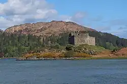 Castle Tioram (/ˈrəm/; Scottish Gaelic: Caisteal Tioram, meaning "dry castle") is a ruined castle that sits on the tidal island Eilean Tioram in Loch Moidart, Scotland. It is west of Acharacle, approximately 80 km (50 mi) from Fort William. Though hidden from the sea, the castle controls access to Loch Shiel. It is also known locally as Dorlin Castle. The castle is a scheduled monument.[1]