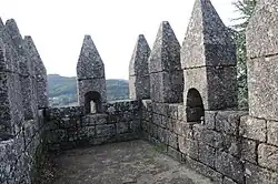 The castle is situated in a rural landscape, isolated and implanted mount 385 metres (1,263 ft) along a massif range called as Laje Grande, that divides the watersheds of the Cávado and Ave river systems.[1] The highest point of the mountain consists of the a large rocky hilltop, where the medieval castle overlooks the town of Póvoa de Lanhoso.[1] The location is situated over a small fertile valley that is well irrigated, crossed by the Ribeira da Póvoa, Ribeira Pereira and Ribeira de Pregal, that are tributaries of the Ave watershed. Half way on the flank, on the road accessway are vestiges of a Romanized settlement of pre- to proto-historic nature.[1] At the top of the mount, within the walls of the castle is the Sanctuary of Nossa Senhora do Pilar, with a winding "Via Sacra" that extends from the foot of the hill, punctuated by five chapels and a support building for pilgrims with restaurant.[1]