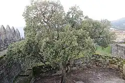 The keep tower, surmounted by merlons, is 10 metres (33 ft) high and is accessible by an arched doorway 3 metres (9.8 ft) above the ground.[1] The line of walls circle the terrain within which is the alcalde's citadel and a large cistern.[1] The vestiges of the old citadel include its foundations and towers at the angles and part of an accessway, that allude to the pre-Roman relief.[1] Internally, the rectangular space includes two lines of pillars.[1]