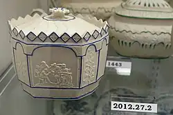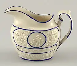 Unlike Wedgwood's Jasperware and other types, where the reliefs were made separately and applied, in Castleford-type wares the reliefs were carried in the moulds, into which the clay was pressed, with two mould for the halves of the main body, the handle being joined later.[11]