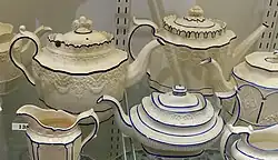 "Basalt ware" teapots and other large teaware items are the other main type of object associated with Dunderdale's Castleford Pottery. These, also made elsewhere, are in a similar style (without enamel) and sometimes both types are found from the same moulds.[9] They also made pearlware of good quality, some of which was transfer-printed in ornate designs in the style which was becoming popular after 1800.[10]