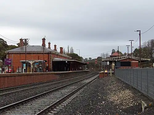 Castlemaine railway station is a regional railway station on the Deniliquin line, part of the Victorian railway network. It serves the north-western suburb and town of Castlemaine, in Victoria, Australia. Castlemaine station is a ground level staffed station, featuring two side platforms. It opened on 21 October 1862.[2][3]