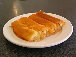 Knafeh[1] (Arabic: كنافة) is a traditional Arab dessert made with kadayif (spun pastry dough)[2][3] layered with cheese and soaked in a sweet, sugar-based syrup called attar.[4] Knafeh is a popular throughout the Arab world, especially in the Levant,[5] and is often served on special occasions and holidays.[4][6][7] The most common variant of knafeh in Jordan and Palestine, Knafeh Nabulseyeh, originated in the Palestinian city of Nablus.[8][5][9][7]