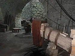 The hammer utilized to strike the massé represents the primary tool employed by the forge. A hydraulic wheel drives the hammer. The wheel is affixed to a cylindrical wooden axle, with cams protruding from its circumference. The cams are designed to grip the tail of the hammer,[Notes 2] which is positioned perpendicularly and movable vertically on an axle. The hammer is elevated until the cam releases its grip and falls back.[5] At this juncture, the subsequent cam advances to initiate a repetition of the process, as mentioned earlier. The anvil, the point at which the hammer headlands, is fitted with a removable metal pile in its center, which can be changed according to the nature of the work in progress. Similarly, the hammerhead is a heavy metal mass, but its lower part—the part that comes into contact with the hammerhead—is also removable. The cadence of the hammer blows is regulated by varying the rate of fall on the wheel.[2]
