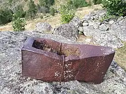 The foyer is a quadrangular mass of masonry (comprising clay and large stones), measuring 2.5 to 3 meters in length and 0.70 to 0.90 meters in height. One of its sides is inclined at an angle to the ground. The hearth is positioned at the intersection of two walls. The dimensions of the furnace vary depending on the smith and their specific requirements. The base of the furnace, or hearth, is constructed from a single large slab of granite or gneiss. The stones that support and surround the crucible are frequently grindstones or fragments of old millstones, preventing water or humidity accumulation. The wall on the shorter side of the crucible is arched and has an opening through which the nozzle from the windbox can pass.[5][2]